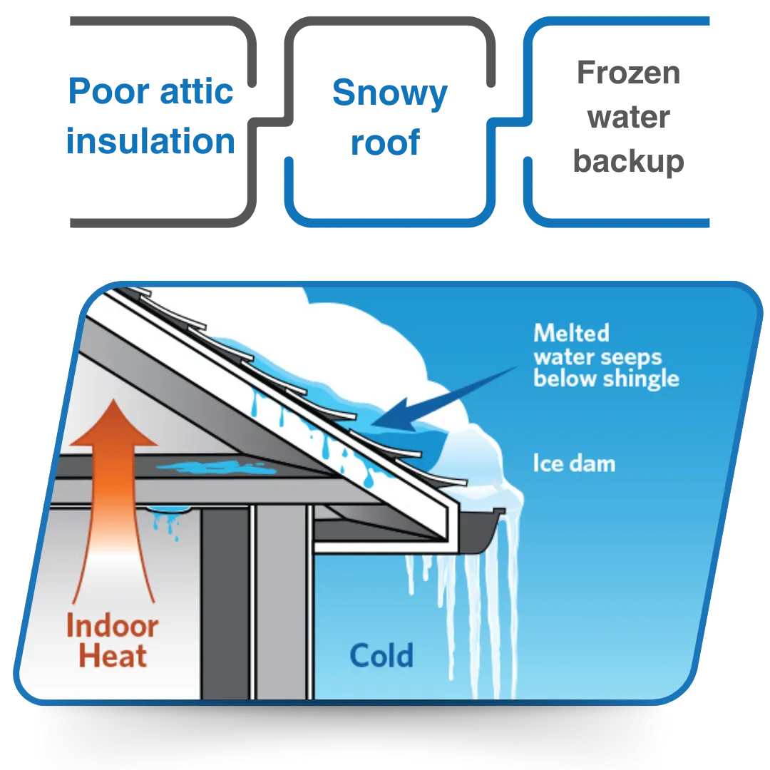 Ice dams form when snow on your roof melts and refreezes at the edges, creating a barrier that traps water.